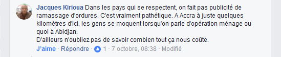 « Dans les pays qui se respectent, on fait pas publicité de ramassage d’ordures. C’est vraiment pathétique. A Accra, à juste quelques kilomètres d’ici, les gens se moquent lorsqu’on parle d’opération ménage ou quoi à Abidjan. D’ailleurs, n’oubliez pas de savoir combien tout ça nous coûte. », s’offusquait sur Facebook le blogueur ivoirien, Jacques Kirioua, spécialiste en foresterie et sciences de l’environnement, Consultant en agriculture durable. Et ce, dès l’apparition des premières images de l’opération ‘‘Grand Ménage’’ 8 sur le réseau social adulé des ivoiriens.